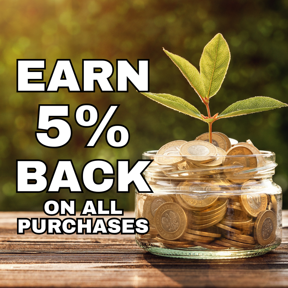 Make purchases on your account and automatically earn 5% back in points. Every $1 spent gets you 5 points! Every 100 points is $1 off your next purchase! In-store or online!